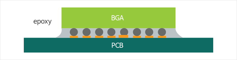 PCB和附属品焊接后向BGA周围点涂底部填充胶(Epoxy),胶液以毛细管形式向 BAL 之间渗透。 通过热或是 UV 反应胶液固化而缓冲外部冲击,从而达到防止龟裂的作用。 一般采用热固化方式,特殊情况下才使用 UV固化。 图中灰色的部分为有底部填充胶(UNDERFILL)的部分。
